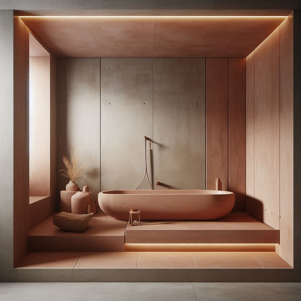 Un espacio relajante donde los acabados cementosos crean una sensación de spa urbano.